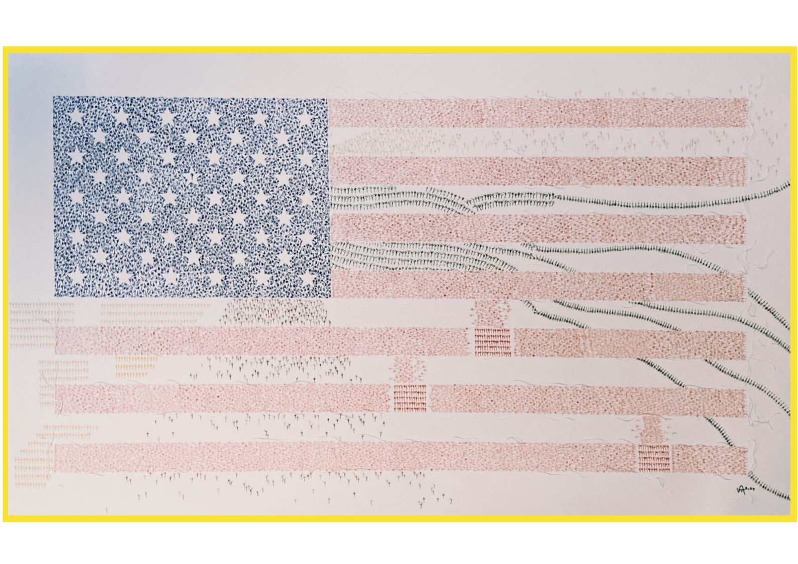 Le drapeau américain n’est pas imprimé, mais réalisé par la couture des éléments de tissus, symbolisant l’union ainsi scellée entre les états fondateurs.